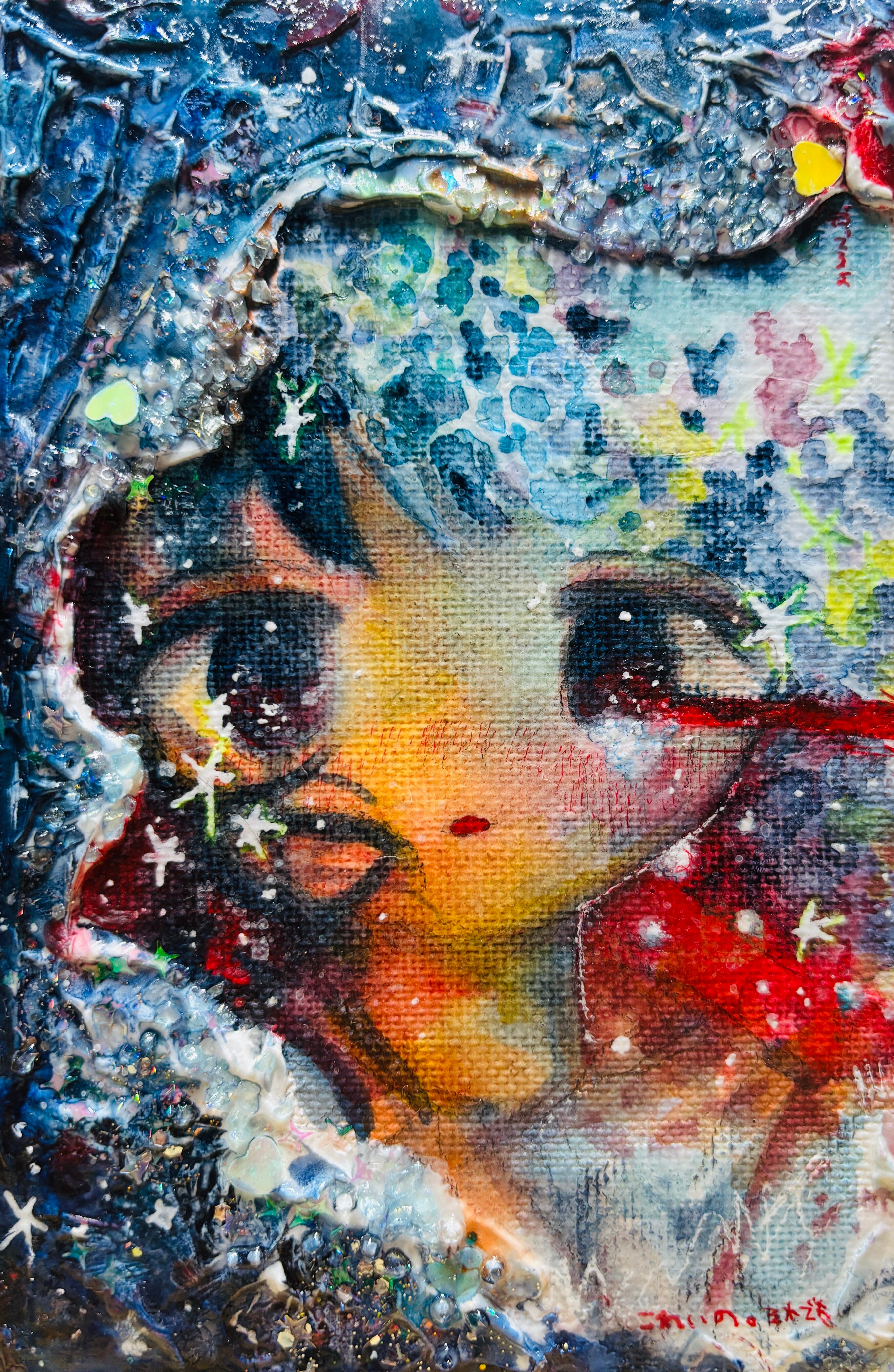 2025年。キャンバス、水彩、アクリル、モデリングペースト、マニキュア、ビーズ、ラメ etc。サイズ148×100×15mm。オリジナル。サインあり。付属の箱はありません。発送は8月19日以降となります。