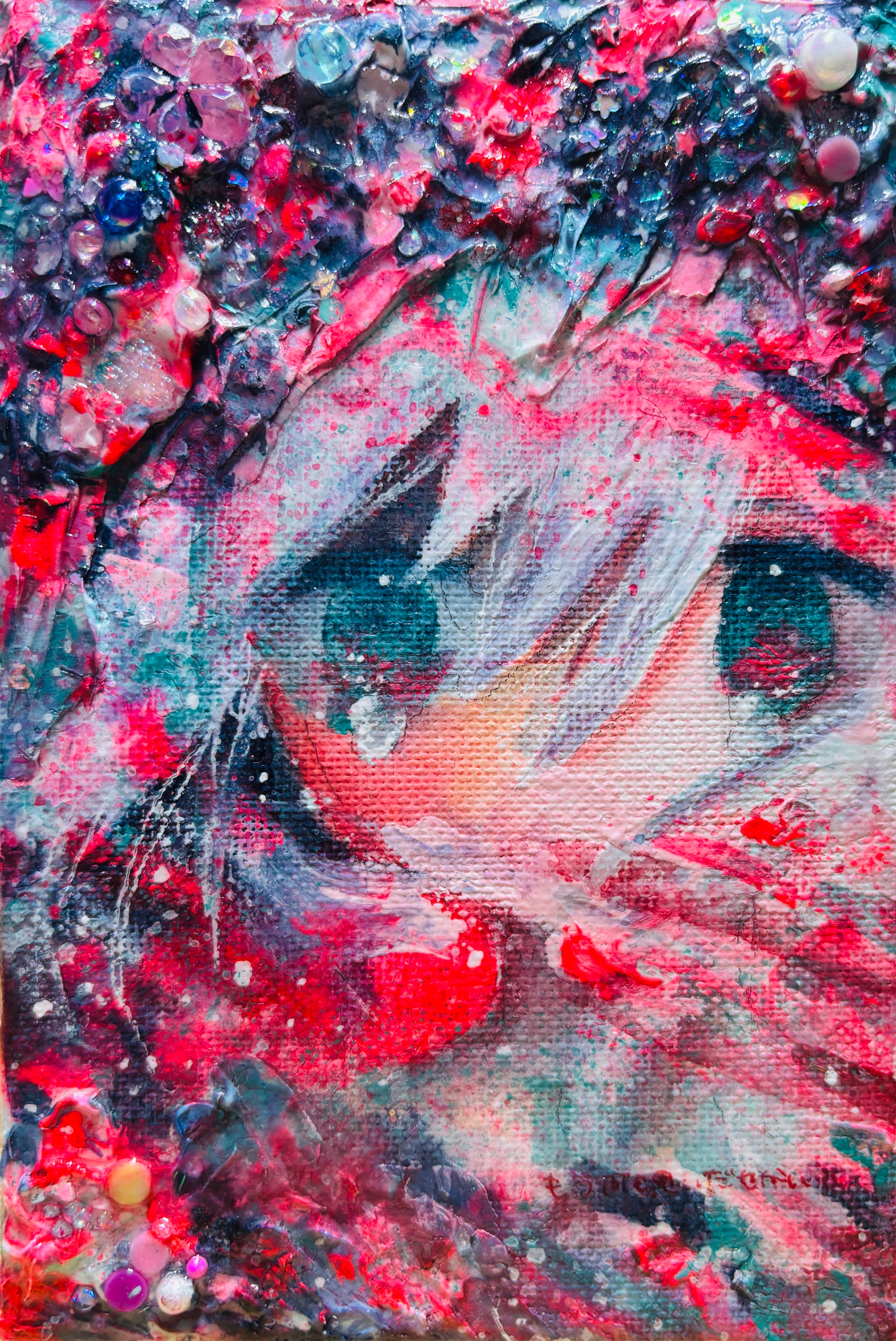 2025年。キャンバス、水彩、アクリル、モデリングペースト、マニキュア、ビーズ、ラメ etc。サイズ148×100×20mm。オリジナル。サインあり。付属の箱はありません。発送は8月19日以降となります。