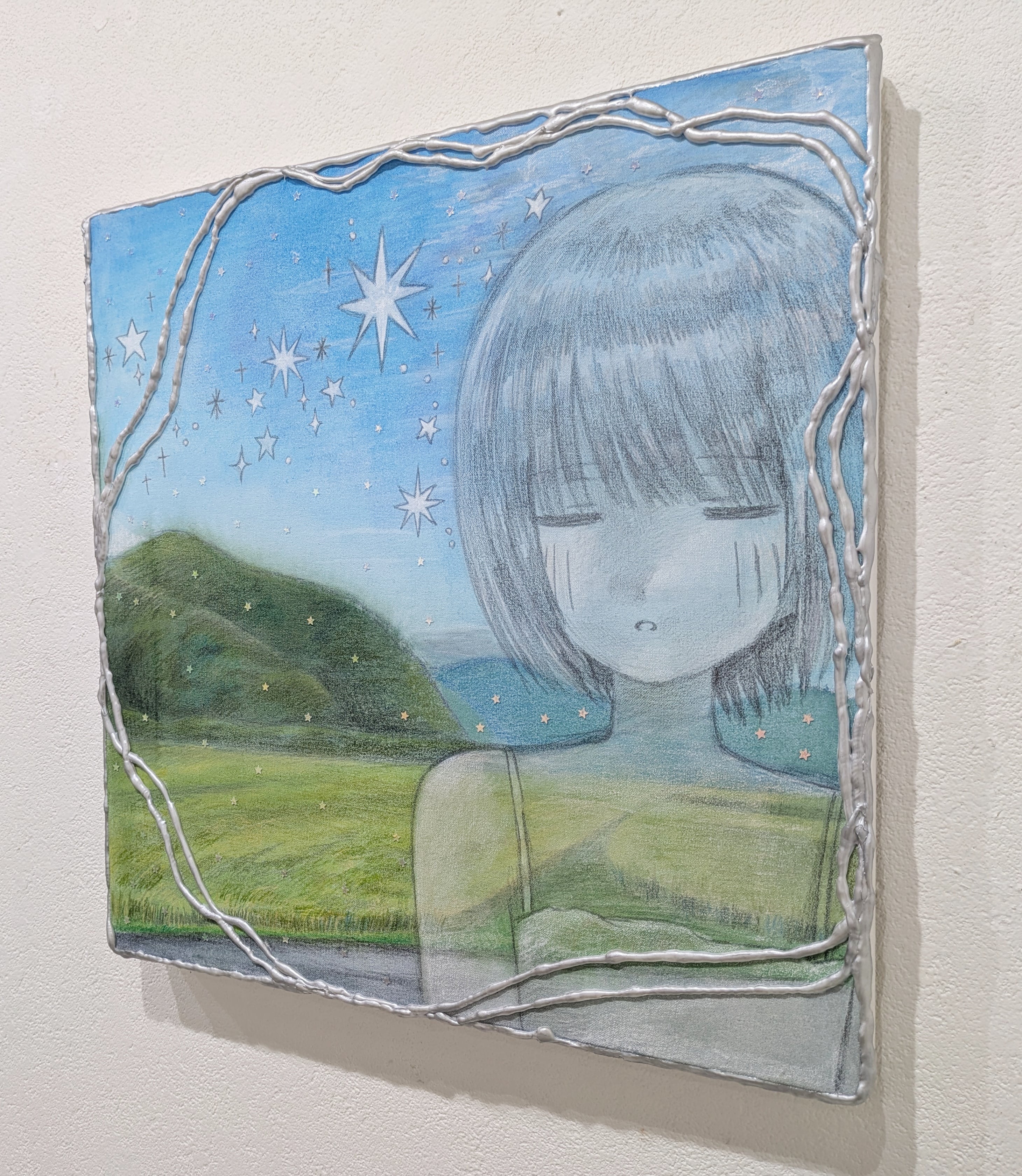 2025年。キャンバスにコットン、アクリル、色鉛筆、グルーガン、デコシール。サイズ340×340mm。オリジナル。サインあり。発送は9月16日以降となります。付属の箱はありません。