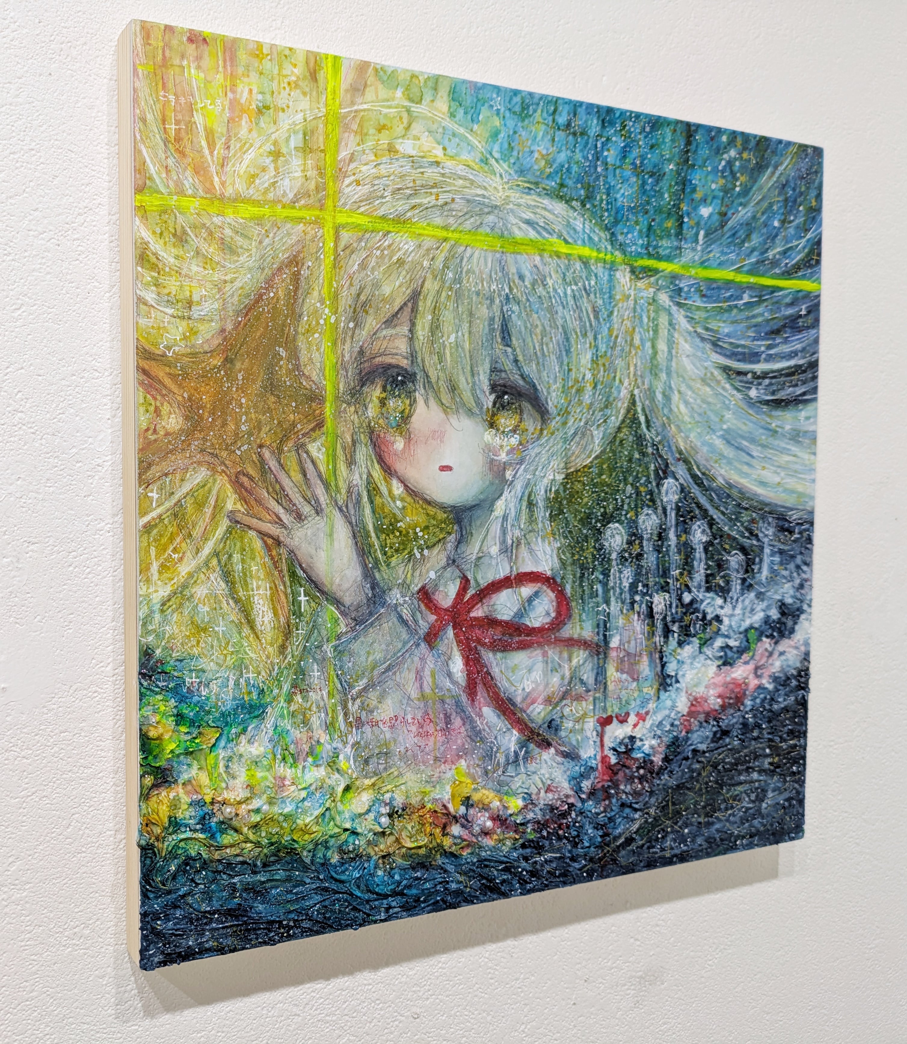 2025年。木製パネル、水彩、アクリル、モデリングペースト、ボールペン、ビーズ、シャーペン etc。サイズ333×333mm。オリジナル。サインあり。発送は9月16日以降となります。付属の箱はありません。