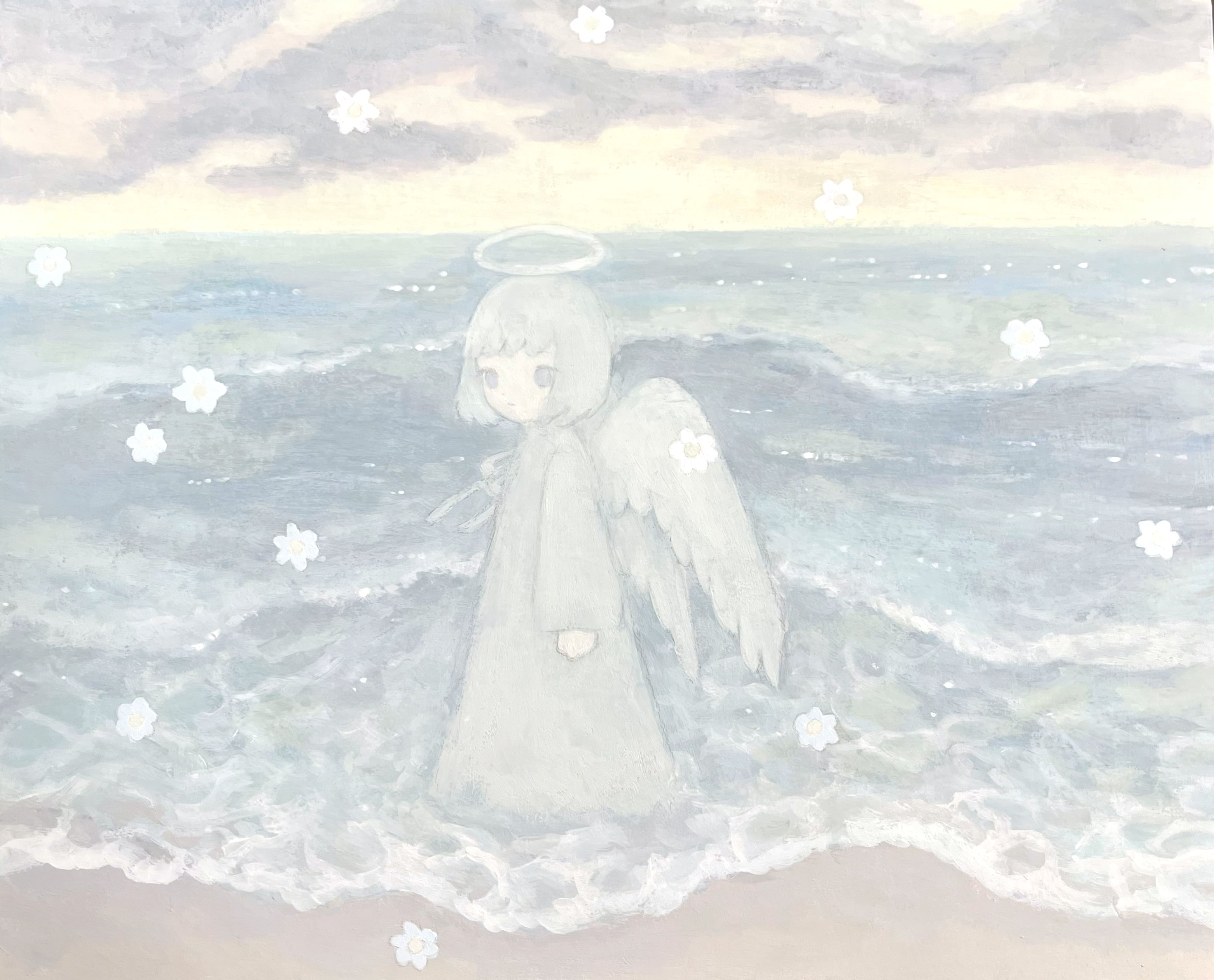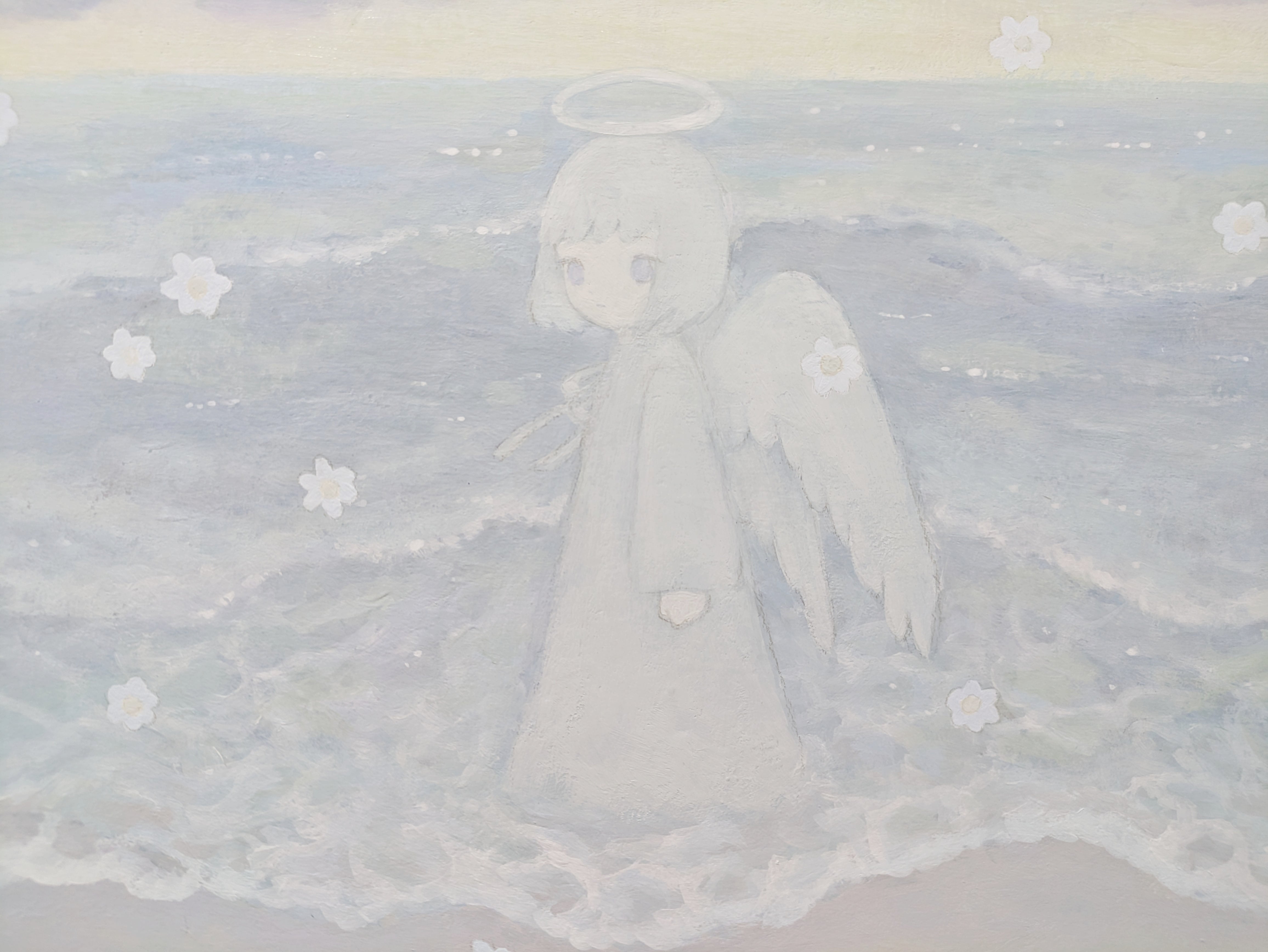 主にアクリルガッシュを使い、子どもや花、植物などをモチーフに淡く優しい世界を描いています