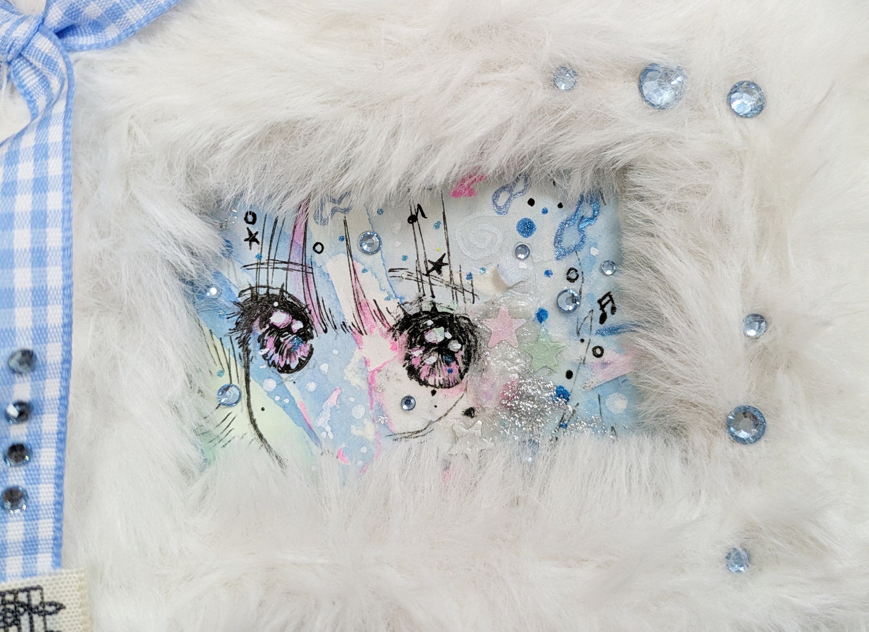 2025年。木製額縁、水彩紙、水彩絵具、アクリル絵具、ラインストーン、リボン等。サイズおよそ額:100×120mm。原画:55×78mm。オリジナル。サインあり。発送は10月26日以降となります。付属の箱などはありません。