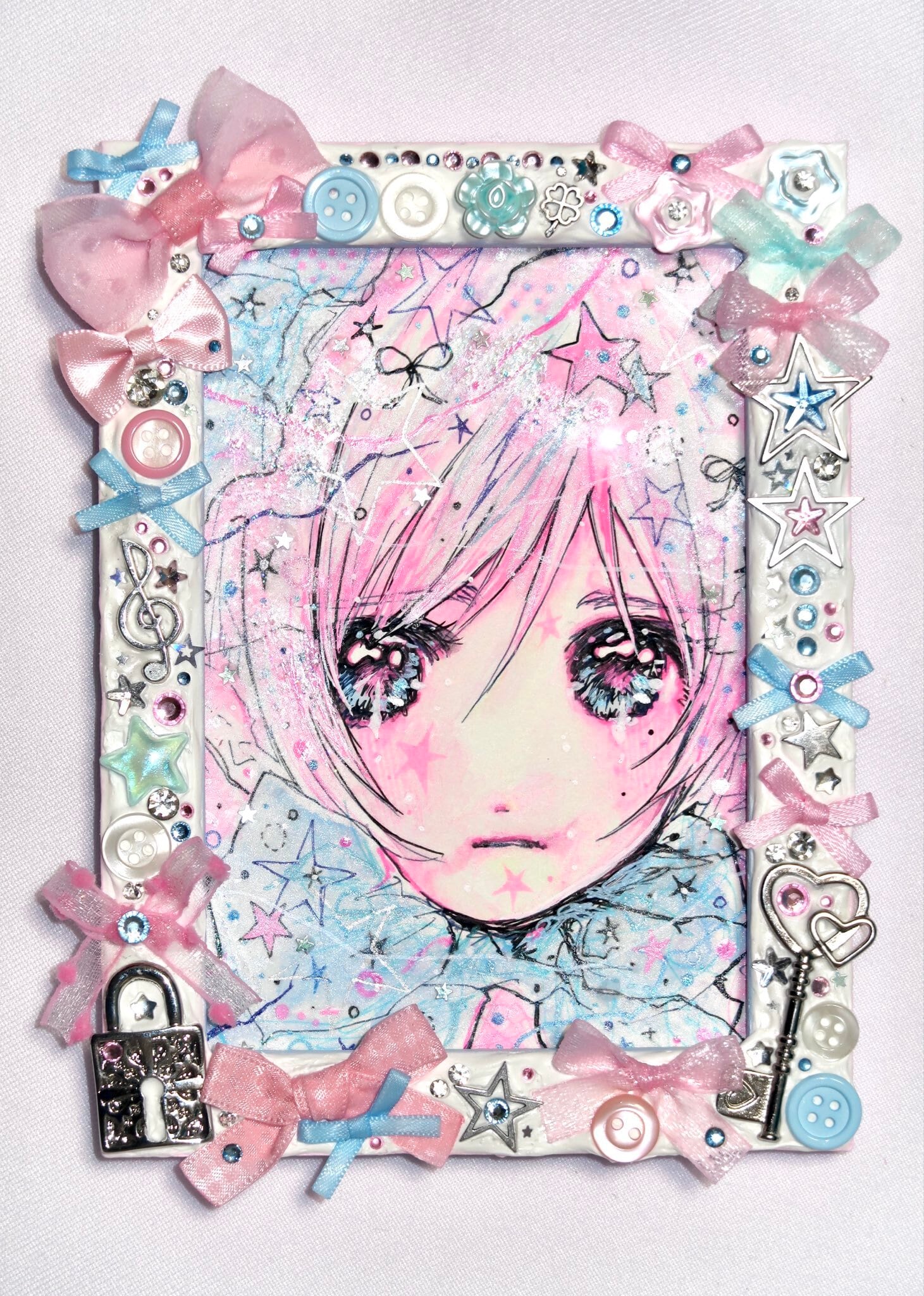 2025年。木製額縁、アクリル絵具、水彩紙、水彩絵具、リボン、スワロフスキー、デコパーツ等。額のサイズおよそ150×112×12mm。オリジナル。サインあり。発送は10月26日以降となります。付属の箱などはありません。