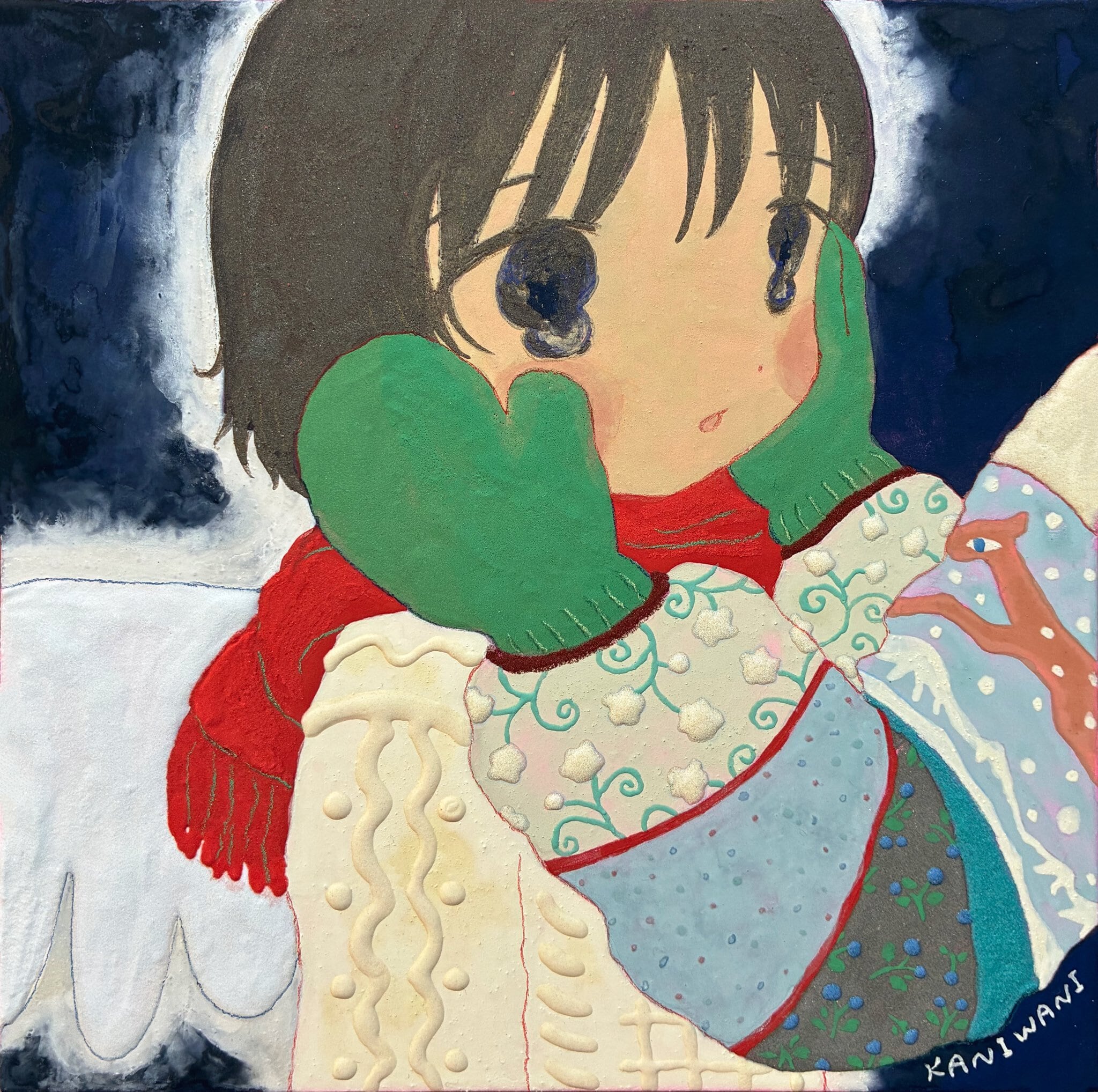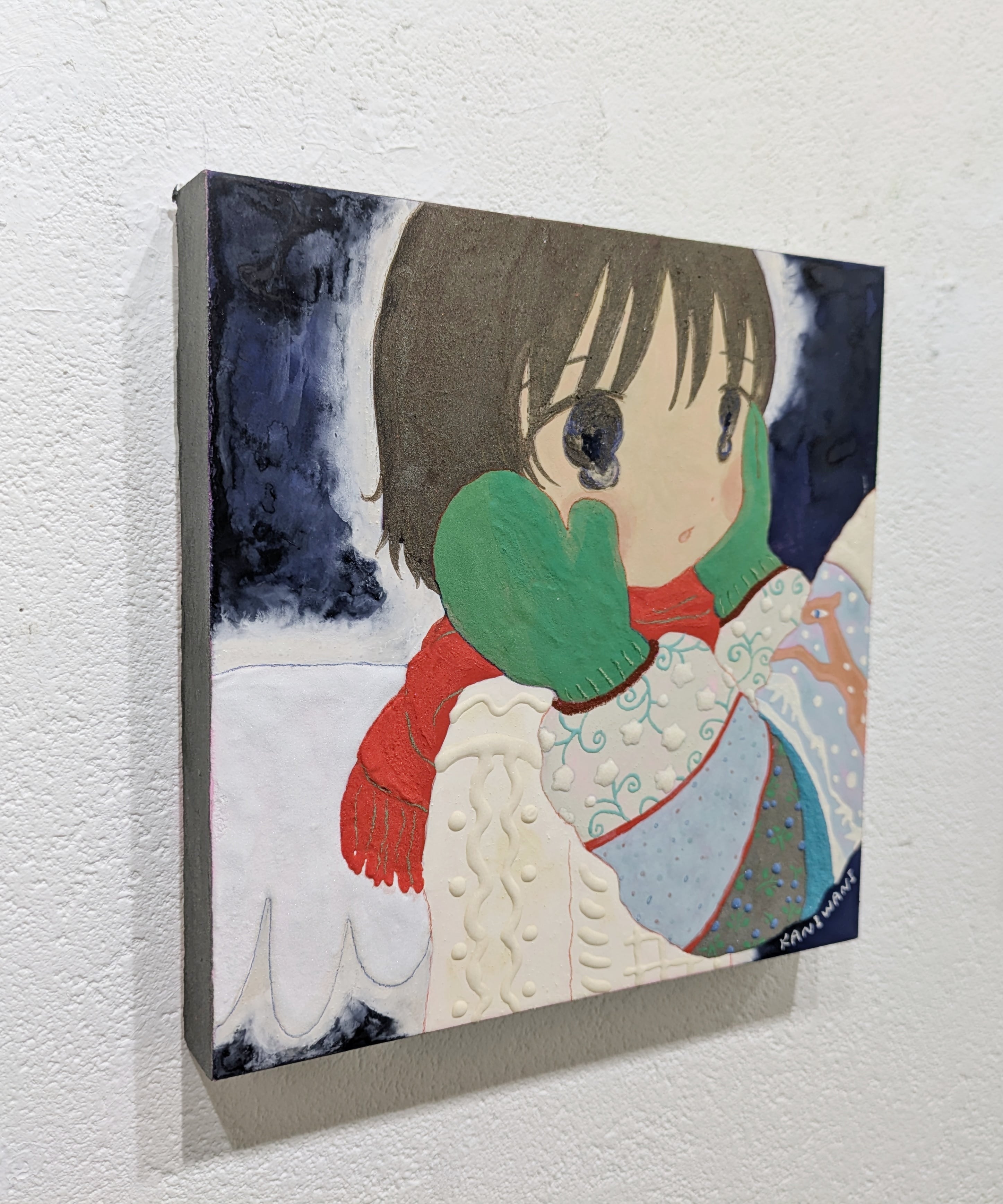 可愛さの中に不思議さや怖さ、懐かしさを秘めている絵を制作している。平面としての面白さと実際に見た時の質感や立体的な面白さの両立を模索している