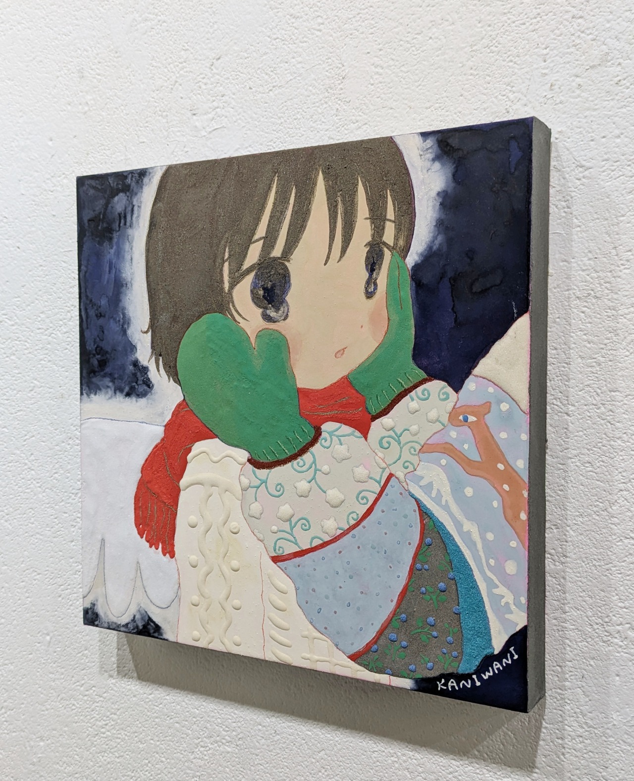 2025年。木製パネル、和紙、水干絵の具、岩絵具、色鉛筆。サイズ180×180mm。オリジナル。サインあり。付属の箱はありません。発送は12月29日以降となります。
