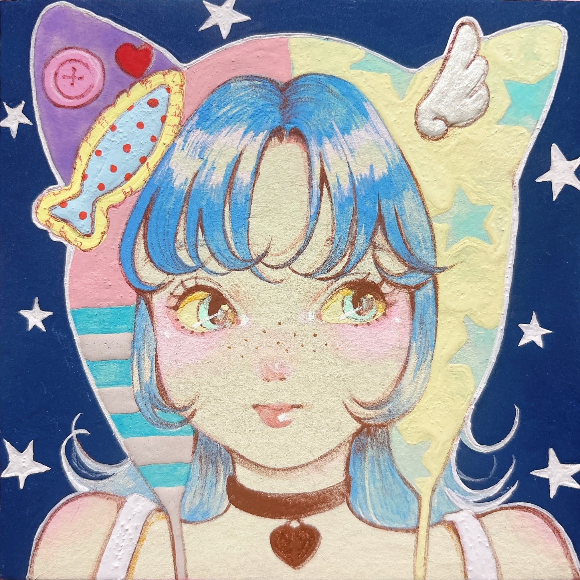 2025年。雲肌麻紙、岩絵具、水干、アクリル、色鉛筆。サイズ120×120mm。オリジナル。サインあり。箱などの付属品はありません。