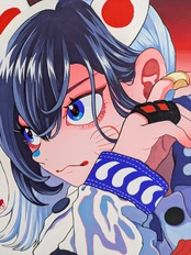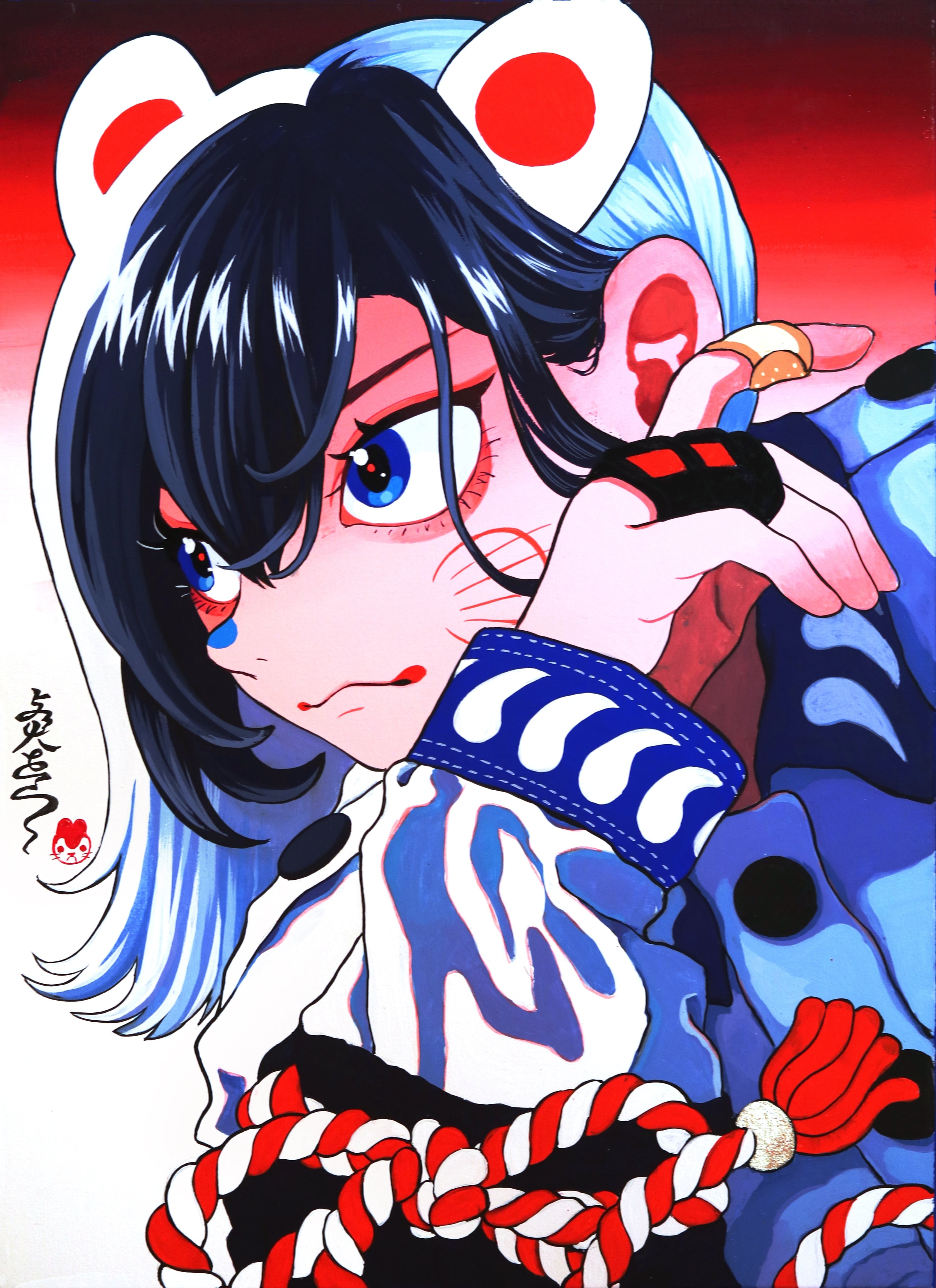 主な画材はアクリルガッシュ。蛍光色を散りばめた鮮やかな色使いが特徴。