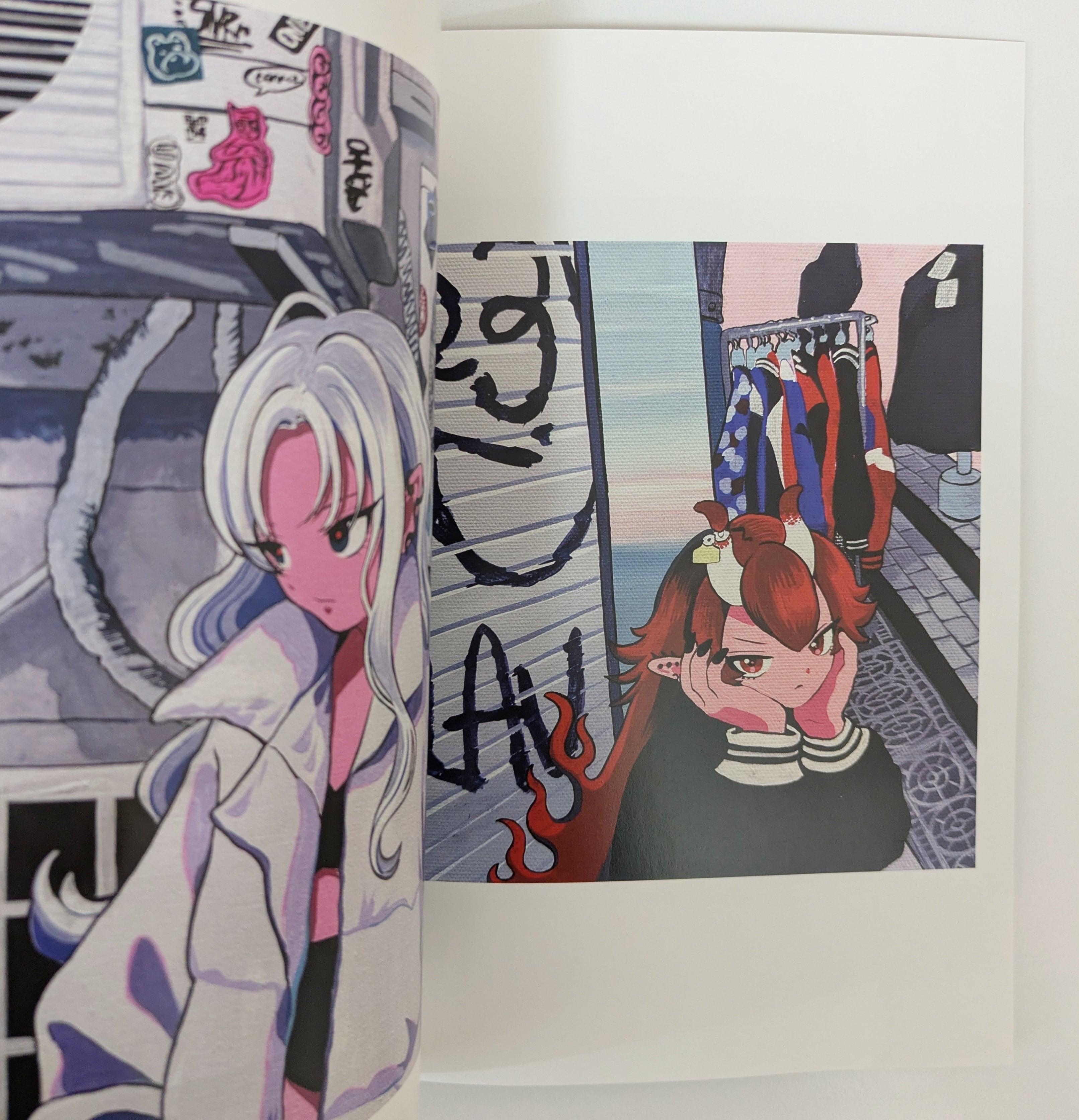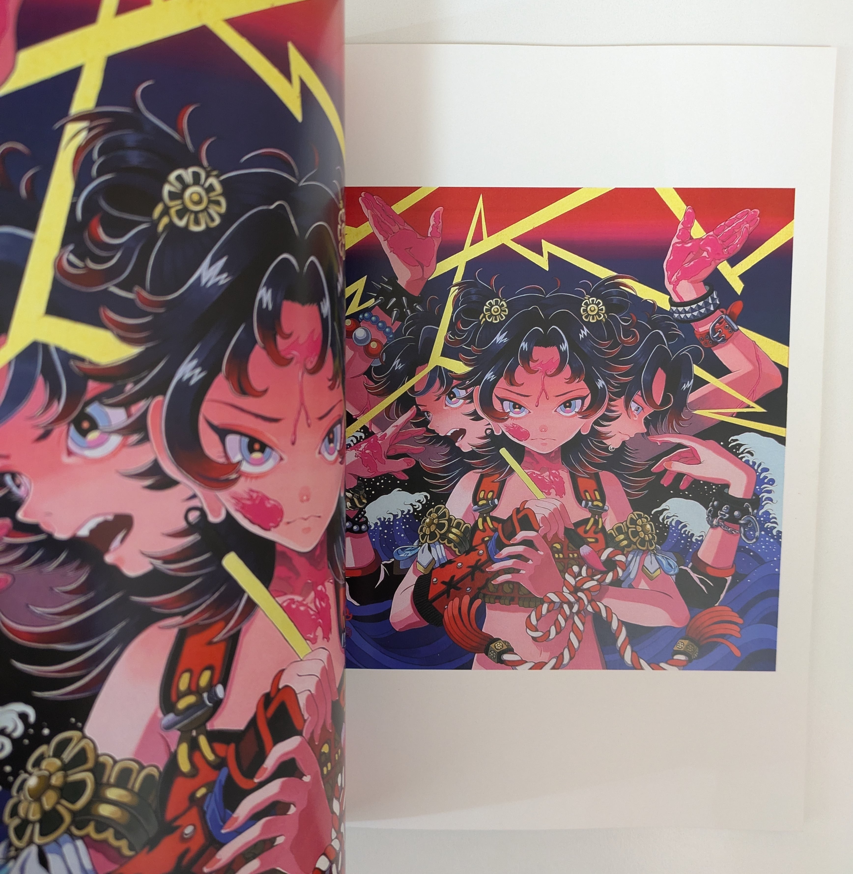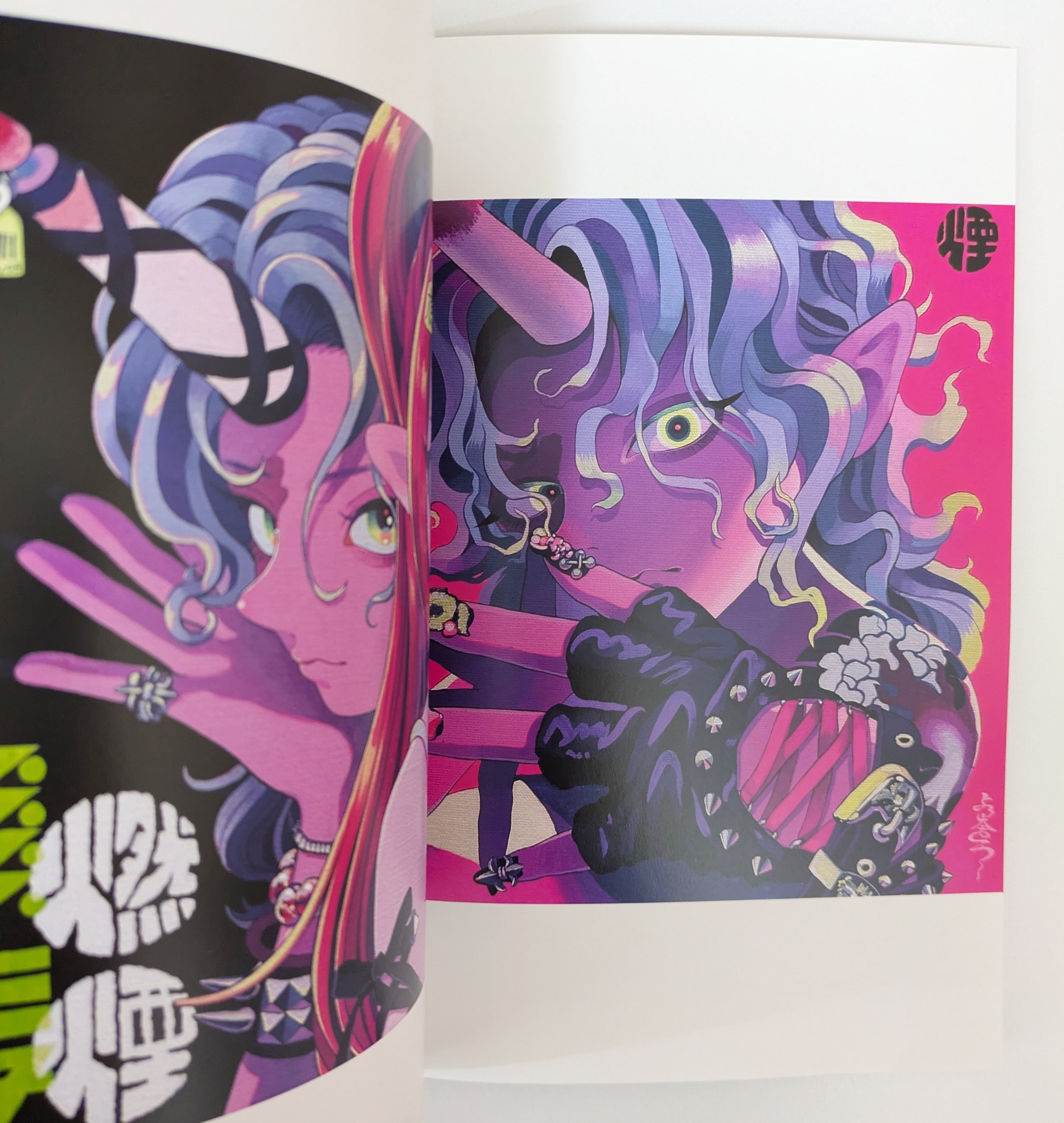 主な画材はアクリルガッシュ。蛍光色を散りばめた鮮やかな色使いが特徴。