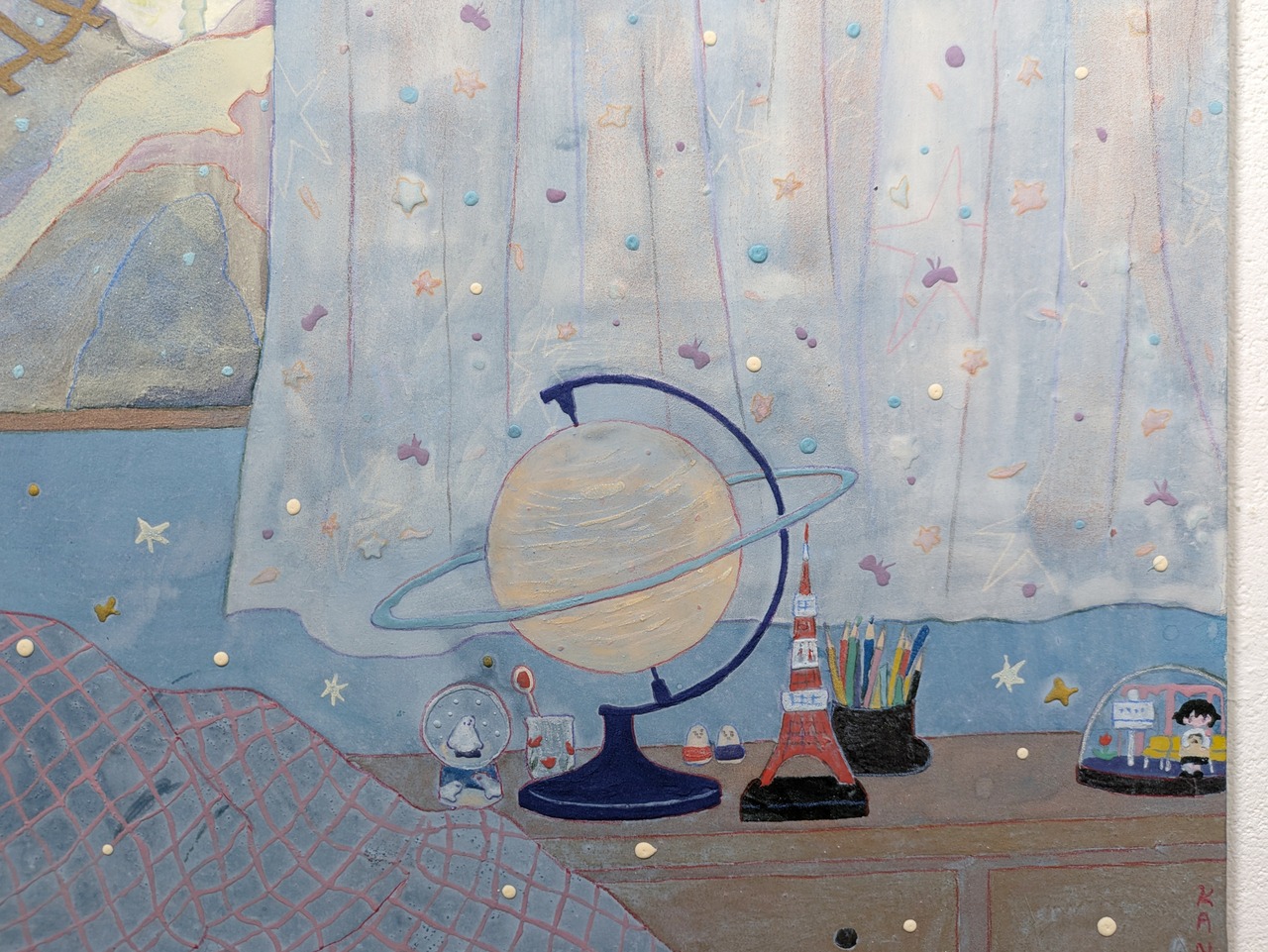 可愛さの中に不思議さや怖さ、懐かしさを秘めている絵を制作している。平面としての面白さと実際に見た時の質感や立体的な面白さの両立を模索している。