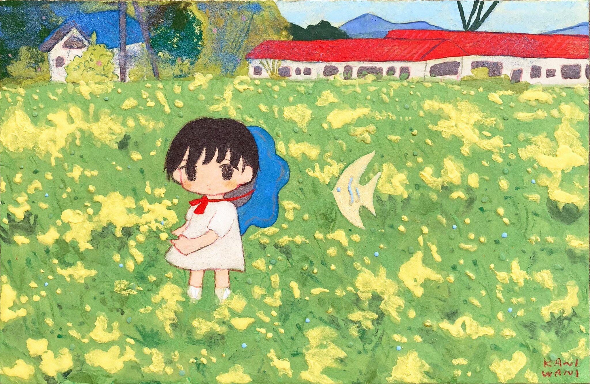 2024年。木製パネル、和紙、岩絵の具、色鉛筆。size 200×130mm。オリジナル。サインあり。箱などの付属品はありません。